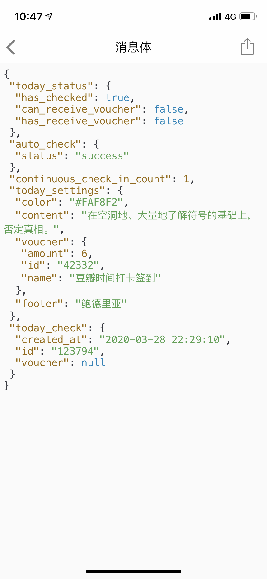 //下面我们来获取数据,result在第一个{},而我们要获取has_checked就要 result.today_status进入到第二个{}