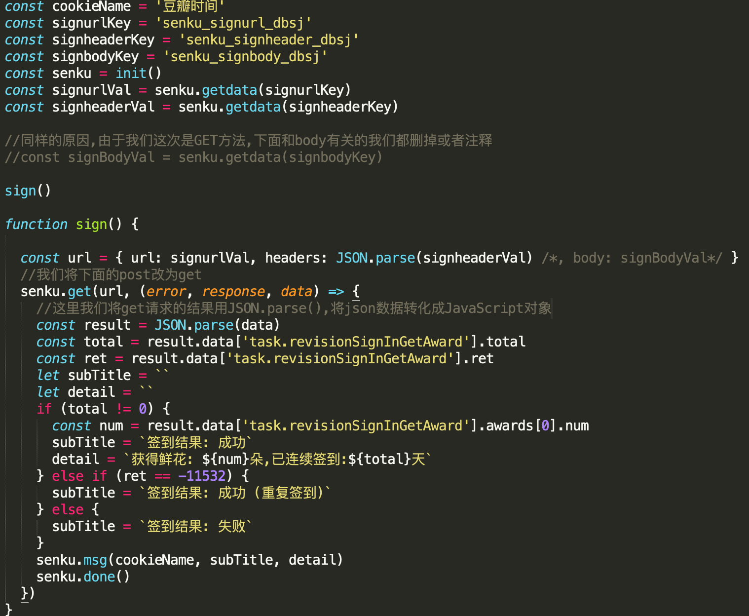 //等于true是因为手动签到的时候 “status”: "success" 你要根据你要编写的脚本具体变化